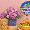 A joyful birthday package featuring fresh flowers, delicious cake, and festive décor for a complete celebration.